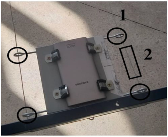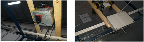 As shown in Figure 5, we have two metal cables in the extremity of the support. This solution has shown some constraints, such as the friction of the box during the displacement. For this reason, we have selected the use of barriers. Then, we have a metal box that consists of a power bank for the power supply of the embedded architecture, and this box carries the different cameras used. As a second solution, we proposed the use of wheels with electric motors for the movement in the two barriers. Figure 6 shows the box used.