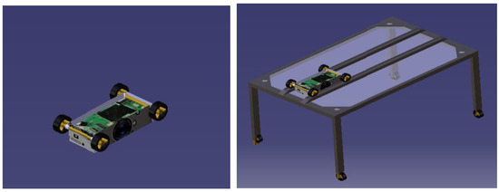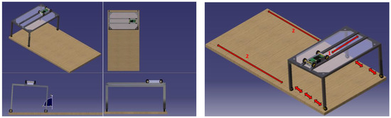 Additionally, we used eight wheels with electric motors, four to drive horizontally, and the others to drive vertically the box’s support. These wheels will realize a scanner principle with a horizontal and vertical displacement to guarantee a general vision of the field that will be handled. The wheels used can be changed if we have problems of movement related to the geography of the agricultural areas. For some applications, we need big wheels that will ensure movement without problems. The collection of all these components will give a complete system, as shown in Figure 7 with the different views on the CATIA software.