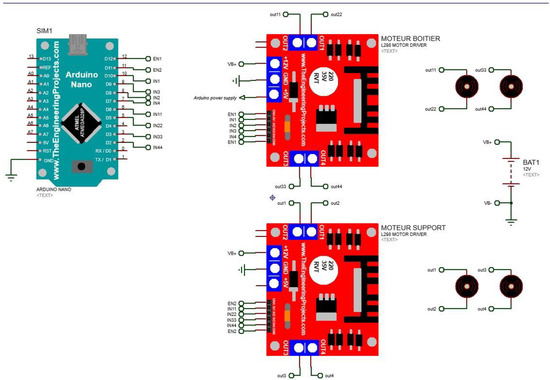 The control of the motors was based on a low-cost Arduino Nano board, and we used only two boards for the driver’s motor. The first will control the support motor and the other for the box. These drivers allow us to synchronize all the motors to ensure a simultaneous movement of the support and the box. The role of the Arduino board is to control the motors through the drivers. Figure 9 shows the electrical diagram of our system.