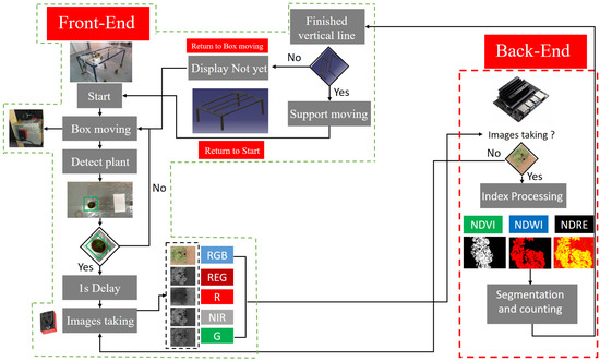 The back-end part is based on image processing and is divided into three functions. The first function is for the pre-processing of the images, the second for the indices processing, and the third for the counting operation. After the algorithm finishes the back-end, it goes back to the front end, then a test if the system has finished the vertical line is applied. If yes, it will move all the metal support. If no, it will move only the box for the next plant.