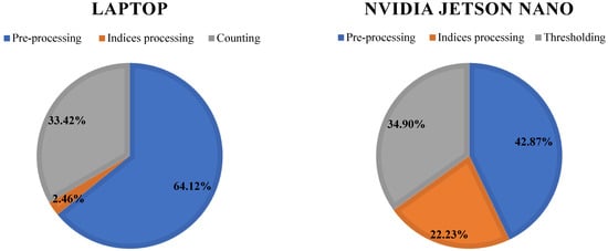 In Figure 11, we can conclude that in the laptop, the pre-processing part occupies more than 64% of the processing time, while in the Jetson Nano architecture, we have only 42%. After the time analysis, we decided to accelerate the three functions to decrease the processing time to satisfy the real-time constraint. Table 2 shows a processing time comparison on the laptop and Jetson Nano based on C/C++ and CUDA.