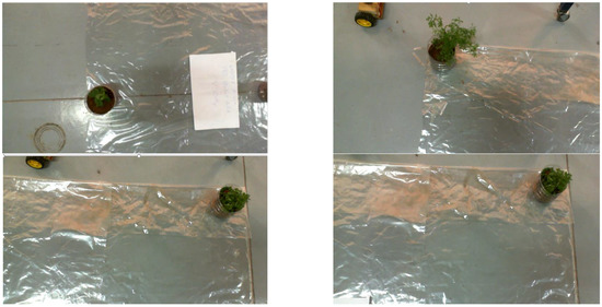The first step that was performed was the testing and validating of our robot in a closed space based on three rows to validate the mechanism of our system. each rows contain mint, parsley and pepper plant, respectively. The validation of this system in a closed space does not imply accurate functionality in a real environment. For this reason, we have opted after the validation to make a real test in order to validate our algorithmic and systematic approach. In Figure 13, we have on the top left the developed robot and, on the bottom, a multispectral and RGB camera view. In the bottom right image, we have the box that contains the Arduino architecture that operates the movement part of our robot. Figure 14 shows images collected by our robot.