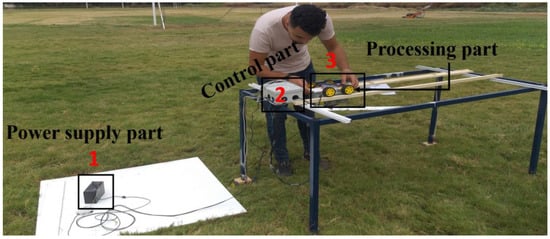 This support is equipped with two barriers in the extremities. The role of these barriers is to guarantee the flow of the processing system. These barriers will support the box that contains the RGB camera, multispectral, and the embedded architecture. In this context, we have tested several solutions based on just two cables that will ensure movement. But the problem of these cables is the movement of the box that influences the speed of displacement due to friction. Figure 5 shows the solution that was proposed before the two barriers.