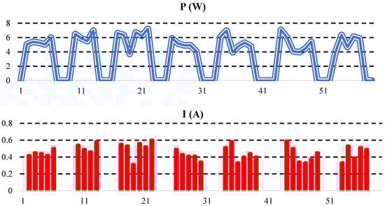 In Figure 16, we have measured the current consumption of the electric motors and the power. We tried to make several iterations to see each time the consumption. The maximum power consumption is about 2.9 W, and for the current consumption is 0.59 A.