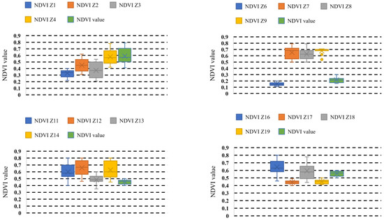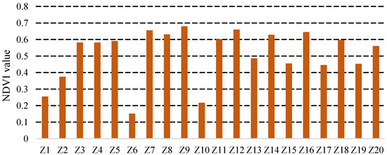 The approach used in this work was based on evaluating several indices, namely NDVI, NDWI, and NDRE. Then, these indices will be collected on all 20 zones to determine the region with low indices. Afterward, we try to determine the GPS coordinates of each region with its index. The first index that has been calculated is NDVI. Figure 17 shows the evaluation of NDVI in the 20 zones.