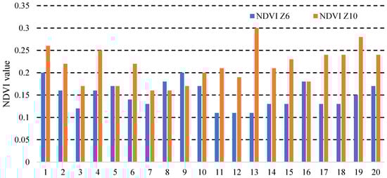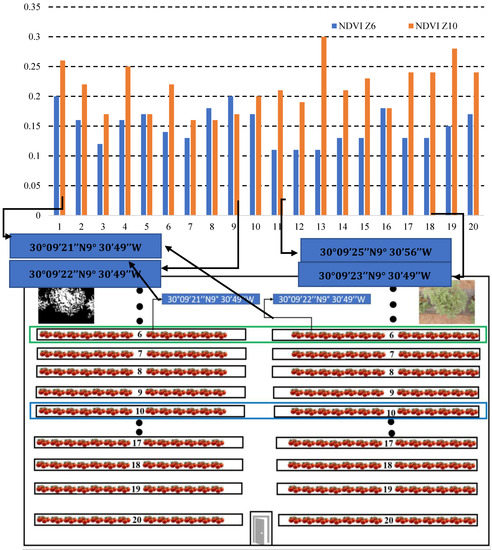 The results in Figure 18 show that zones 6 and 10 give a low index compared to the other zones. Usually, the mean values vary between 0.15 for zone 6 and 0.67 for zone 9. Zones 6 and 10 present low values due to the supply system of the necessary plant components. This reflects the strong relationship between vegetation, water, and the nitrogen content in the plants. After locating the region with a low index, we tried to locate the plants with the vegetation index. Figure 19 shows the vegetation index calculated for each plant.