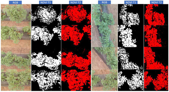 As a result of evaluating the different plants in the areas with a vegetation problem, we determined the plant’s exact position through the images collected with the precise GPS data of the Parrot Sequoia + camera. This localization gives us the plant where we have the vegetation problem, which will help the farmer or robots make precise decisions. Figure 20 shows images of the plants and their NDVI results. In Figure 20 are the RGB images of tomato plants collected in the greenhouse, and we have the evaluation of the binarized NDVI index using the threshold T1 = 0.5. Additionally, we have tried to vary the threshold for the red images with T2 = 0.4. This threshold variation shows the plants that have an index more than T1 or T2. This operation will help us to classify the final results. To determine the index with its proposed threshold, we need to take the plants of each type and create a test with the vegetation sensors afterward to provide each plant with its own index for decision-making.