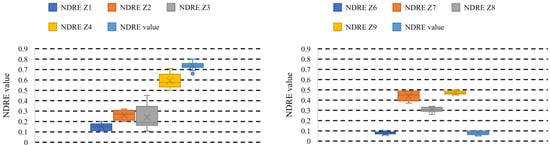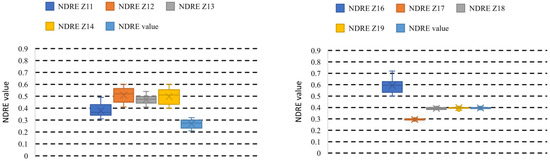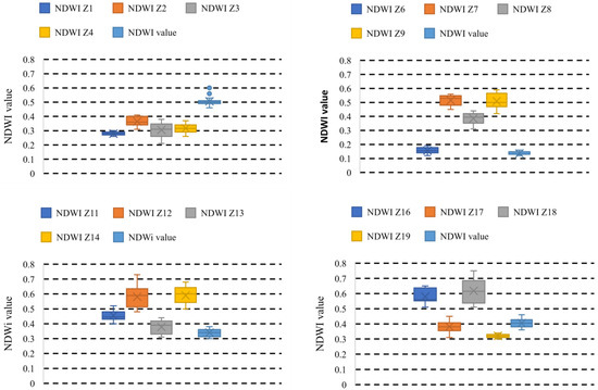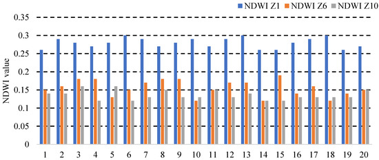 The NDWI evaluation is based on a threshold of 0.3. Areas with less than 0.3 have a water deficiency or water absence, while areas with more than 0.3 have water. The index evaluation showed that, like the NDRE, areas 1, 6, and 10 have low water content. Figure 25 and Figure 26 present the results in each zone.
