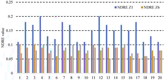 After determining the NDVI vegetation index, we need to calculate the other indices, such as NDRE and NDWI. The reason for calculating these indices is that vegetation is not enough to indicate that the plant is in good condition. The second evaluation was based on the NDRE index shown in Figure 21. The NDRE evaluation was based on a 0.2 threshold. Regions with an index lower than 0.2 suffer from a nitrogen deficiency in the plants. Figure 21 summarizes the results obtained for 20 zones that have been evaluated. The results show that the index varies between 0.079 and 0.75 in zones 10 and 5, with minimum and maximum values. We also find zones 1 and 6 with NDRE values of 0.15 and 0.08. These regions reflect the nitrogen lack in plants. Similarly, for the vegetation index, we have zone 6 and 10 that are in the same situation. On the other hand, in the evaluation of NDRE, another zone that suffers from a lack of nitrogen has been added. After a first synthesis, we concluded that the suffering zones are 6, 1, and 10. For this reason, it is necessary to extend the evaluation and see the average of the NDRE index in the different regions. Figure 22 shows the different areas’ evaluation based on each zone’s average.