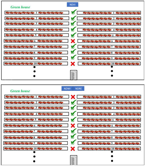 Greenhouses present a robust solution to increase plant yield. These closed greenhouses help control several crop types to improve the performance of plants. Generally, the monitoring is manually performed based on the experience of the farmers. This leads to some failures in the decision-making process, affecting the crop’s productivity and reducing agricultural product yield. Therefore, our work will focus on tomatoes plant. The tomatoes prefer humus soil, rich in nutrients and which warms up quickly. It is very greedy, and requires constant fertilization before its installation and throughout its cultivation. Therefore, tomatoes require vital signs monitoring, including water, nitrogen, and vegetation. For this reason, we have evaluated the three most used indices for monitoring. The indices are the normalized difference red edge index (NDRE), normalized difference vegetation index (NDVI), and normalized difference water index (NDWI). The NDRE is based on red-edge reflection and Near infrared (NIR) to estimate the nitrogen quantity in the plant. The NDRE index is based on the red edge reflection and the NIR estimates the amount of nitrogen in the plant. The NDWI is based on the green and NIR band estimates the water amount. Equations (1)–(3) show the bands used to calculate these indices, with BNIR representing the Near-infrared band, BR Red band, BG green band and BRedEdge Red-Edge band [25,26,27].