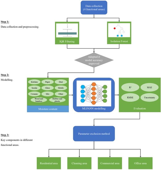 In this paper, based on physical composition in four functional areas, an ANN model for predicting moisture content of MSW was developed. IQR and isolation forest were applied to detect and remove the outliers. Furthermore, R2, MAE, RMSE and k-fold cross-validation were applied to evaluate the accuracy and uncertainty of the model. Finally, a parameter exclusion method was adopted to analyze the key components of MSW for the prediction of moisture content in different functional areas.