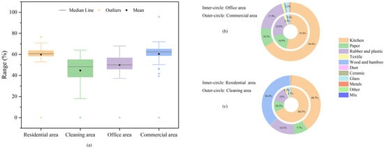 According to the box plot of moisture content in Figure 2a, residential and commercial areas have a similar mean moisture content (59.9% and 60.4%, separately) which are the highest among all functional areas, followed by the office area (49.9%) and cleaning area (44.7%). Outliers appeared in all functional areas and were mainly concentrated in the range of small values. The physical composition of MSW in functional areas was also different, with kitchen waste as the most abundant component in all areas. However, in the cleaning area, wood and bamboo waste (36.4%) had a similar proportion with kitchen waste (40.7%). As with other reports about functional areas [17,18], huge differences of moisture content and physical composition were found, which suggested different relationship in different functional areas.