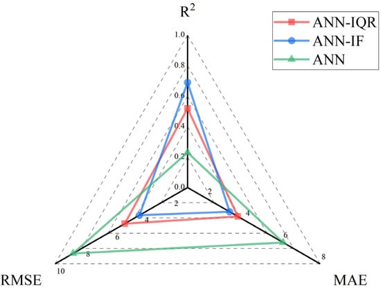 In filtering, using the inter quartile range (IQR = 12.64 (%), Q1 = 49.69 (%) and Q3 = 62.34 (%)), the moisture content smaller than lower bound = 30.72(%) and larger than the upper bound = 81.31(%), were filtered out. After removing these anomaly data, the remaining 404 datasets were used to train the ANN-IQR model. To maintain the similar range of removed data with IQR, anomalous data removal rate for isolation forest was set to 5%. Compared to IQR, anomaly detection of isolation forest is based on the distribution of data instead of the fixed distance. The remain 403 datasets were used to train the ANN-IF model. In addition, the ANN model using all the datasets without removing outliers were also trained to check whether removing outliers can increase the performance indices. The results are shown in Figure 3.