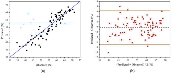 The predicted-observed plot of moisture content indicated stronger correlation between the predictions of moisture content and its actual observations, which are shown in Figure 4a. As shown in Figure 4b, Bland–Altman plots demonstrated low bias in 95% confidence interval, which means acceptable data consistency. In addition, both figures show that reliable prediction results were obtained at the low and high moisture content, which suggest general applicability of the model.