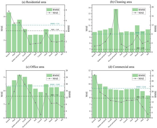 Parameter exclusion is a method to analyze the importance of input parameters on the prediction results in a model. In every single test, one input parameter was removed before training the model. The importance of the input parameters to the model was estimated by the decline of model accuracy to obtain the importance ranking list. Based on four models with all 11 components in cleaning, office, residential and commercial areas, the parameter exclusion method was adopted to remove each component of the models and compare the results with those before.