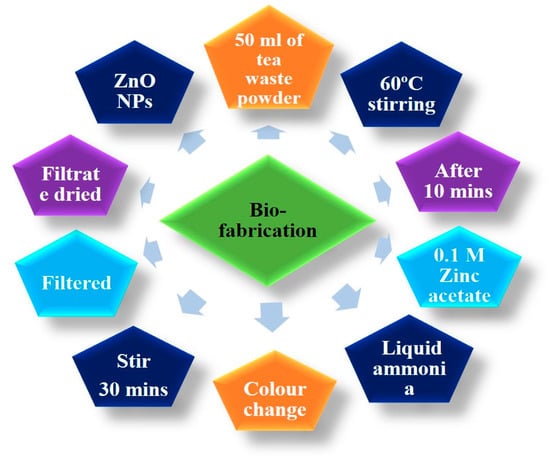 A quantity of 50 mL of tea waste powder extract was added to 0.1 M zinc acetate solution and the mixture was kept in a magnetic stirrer for 30 min at 60 °C. After that, the pH was retained at a value of 8 by injecting a liquid ammonia solution. The solution was filtered using Whatman No. 1 filter paper after progressively becoming colloidal. After obtaining the green-synthesized ZnO, the surplus liquid ammonia was repeatedly washed away with Milli Q water. The resulting pellets were then dried for 2 h in a hot air oven at 80 °C. Powdered ZnO nanoparticles were retained and stored for future investigations (Figure 1).