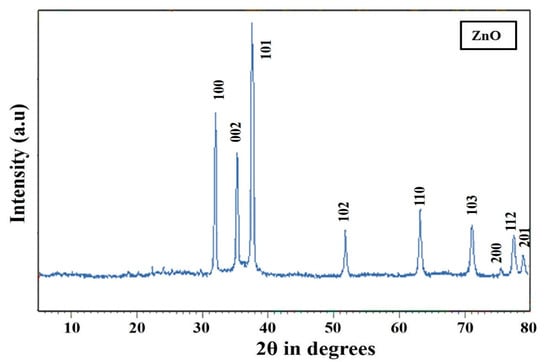 The spectrum of green-fabricated ZnO nanoparticles is shown in Figure 3. Prominent peaks were identified that were in fair concordance with the published literature from the International Center of Data Diffraction card (JCPDS-36–1451). The peaks in the ZnO nanoparticles spectrum appeared with 2 θ between 20 and 70, with observable diffraction angles of 32.7°, 35.1°, 37.9°, 48.3°, 57.8°, 71.5°, 76.9°, 77.4° and 79.7° that indicated crystal size, and prominent ZnO (hkl) index values of (100), (002), (101), (102), (110), (103), (200), (112) and (201). The average size of the nanoparticles was determined using the Debye–Scherrer equation, which was found to be between 30 and 40 nm []. The results indicated that the fabricated ZnO sample was highly crystalline and had a hexagonal wurtzite crystalline structure, determined using the Bragg equation, λ=2dsinθ; these XRD results were consistent with previous research []. The zinc oxide nanoparticles in the sample were visible in the usual XRD pattern. The produced metal oxide nanoparticle XRD pattern showed a high level of crystallinity in the samples with diffraction angles that conformed to a distinctive face-centered cubic structure. XRD patterns were analyzed to assess the peak intensity, location and breadth [].