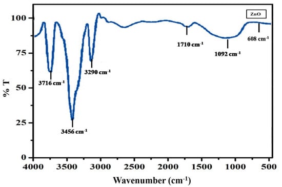 Using FT-IR spectrometry, it was possible to identify the functional groups associated with the synthesis of the ZnO NPs (Figure 4). The existence of octahedral sites was suggested by a peak in the vicinity of 3726 cm−1 []. According to Anbuvannana et al. [], the steep peak at 3426 cm−1 is caused by C-H stretching vibrations of carboxylic acid and hydroxyl stretch vibrations, while the peak at 3240 cm−1 is formed by the existence of a hydroxyl group (-OH-) in the oxidized oil []. The band at 10 cm−1 indicated the carboxylic group (-COOH) of the minority polymer [], while the peak from 1092 cm−1 demonstrated the existence of C-O-C bonds []. C-H bending (C=C-H) was responsible for the peak at 608 cm−1 [].