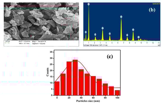 The morphology of the fabricated ZnO nanoparticles was explored using FE-SEM analysis, as shown in Figure 5a. An agglomerated micrograph made it easy to see that the green ZnO nanoparticles were spherical in form. The average particle size of the ZnO nanoparticles was 29 nm. Figure 5b depicts a histogram of the particle size distribution of the produced ZnO nanoparticles. EDAX was also used to investigate the purity and elemental composition of the ZnO nanoparticles. The only elements found in the sample were Zn and O, as shown in Figure 5c.