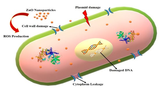 The antibacterial activity of ZnO NPs is significantly influenced by the oxidative stress they create. Zn2+ ions that are created from ZnO interact with respiratory enzymes to limit their activity. It has already been shown that ZnO NPs may disrupt cell membranes and induce ROS. By absorbing Zn2+ ions, the bacterial cell membrane, DNA, and mitochondria are irreversibly damaged, which causes oxidative stress, the production of ROS and free radicals that limit the activity of respiratory enzymes, and ultimately cause cell death. Figure 7 provides a schematic illustration of how ZnO NPs eliminate microorganisms [].