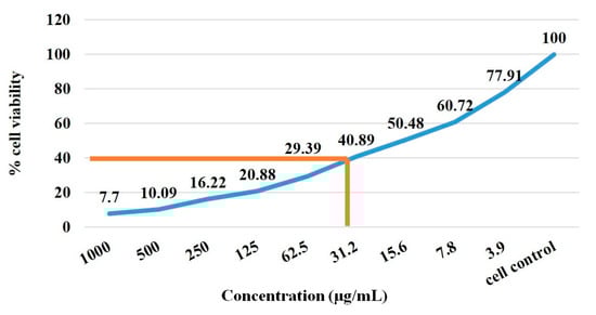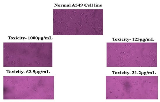 The MTT test was employed to measure the cell proliferation of A549 cancer cells at various concentrations (0.78, 15.6, 31.2, 62.5, 125, 250, 500, and 1000 µg/mL) of fabricated ZnO nanoparticles. The ZnO nanoparticles that were created entered the cells significantly after 24 h of exposure, as shown by the IC50 cell viability of 40.89% (Figure 8). The results showed that bioproduced ZnO nanoparticles seemed to have an impact on the viability of A549 cells even at the lowest concentrations of the provided samples. These results are consistent with those of Vidhya et al. [] and Vijayakumar et al. [] who found that low concentrations of biosynthesized ZnO NPs reduced cell viability. The acridine orange staining of A549 cells is seen in Figure 9. We note that the IC50 values were 31.2 µg/mL when ZnO nanoparticles were exposed to 0.1% DMSO. These results are consistent with those of Namvar et al. [] and Vidhya et al. [], who showed that treatment with 0.1% DMSO reduced the viability of cancer cells stained with acridine orange by 85%.