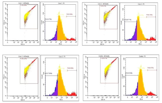 The apoptotic examination of biosynthesized ZnO nanoparticles was further verified using annexin V-FITC/PI dyes and flow cytometry. Figure 10 depicts the cell viability in comparison to the early, late and necrotic stages of apoptosis. Phosphatidyl serine translocation from the plasma membrane’s outer layers marks the beginning of apoptosis. The annexin-V bound to phosphatidyl serine is highlighted by blue fluorescence because of the strong affinity of calcium ions. Late apoptosis is characterized by an increase in membrane permeability; the nucleus becomes red as a result of cellular DNA binding by the PI stain. These results are consistent with the findings of past research studies of the cell cycle, showing that the early stages of cell death are induced by manufactured ZnO nanoparticles in a variety of cell lines, including SHSY5Y cells, neuronal Schwann cells and human skin cancer cells [,].