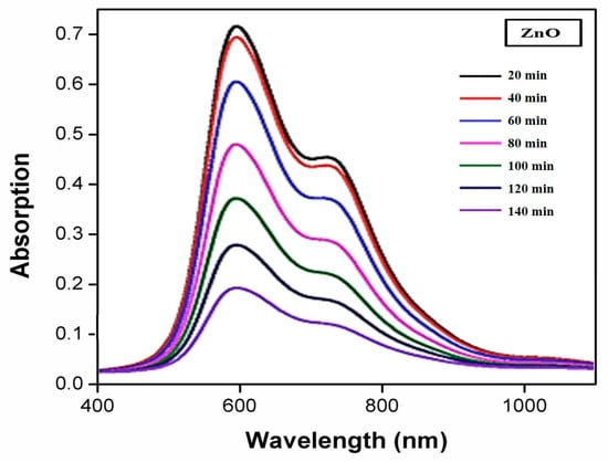 The photocatalytic abilities of the as-prepared ZnO NPs were examined for their ability to photodegrade MB in an aqueous solution. Figure 11 depicts the UV-Vis absorption spectra of MB degradation under UV light using ZnO NPs. A sign of MB degradation was the strength of the peak at 463 nm, which was connected to the typical absorption peak of MB and diminished progressively without changing the maximum absorption wavelength. The dye solution with catalyst was agitated for 30 min in the dark to encourage the adsorption–desorption process; it was observed that 2% of the dye adsorbed. Defects in the ZnO NPs were the cause of this. The MB content steadily dropped under UV light once the photocatalyst had been applied. The degrading efficiency of MB was discovered to be 86% after 140 min of irradiation.
