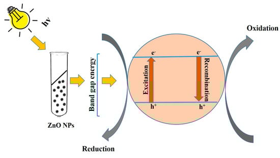 ZnO as a semiconductor absorbs light when its band gap value is greater than the value needed to form electron-hole pairs (e-h+). The conduction band of the ZnO nanoparticles receives the dye’s electron from its excited state. Excitation may be split into electrons and holes, which may then move to the surface of the catalyst and interact with absorbed species to produce redox reactions. As can be observed, the surface-bound reaction of h+ vb with water resulted in the production of hydroxyl radicals, and the oxygen-dependent choice of e cb resulted in the production of the radical anion (superoxide radicals) (Figure 12).
