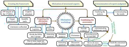 This process involves assigning one or more key contributors to respective SDGs. Nevertheless, the same SDG can be assigned to more than one contributor in certain cases. With this in mind, the first search will be carried out by the decided contributor and the additional contributor will add more analysis. In certain cases, the first contributor adds analysis along with the additional ones. The authors have made an effort to search and provide sufficient evidence for each target with adequate quality. When the assessment is completed for each SDG, reviewer/s will evaluate the contact and causes. The reviewer’s main contribution would be assessing the study objectively and providing alternate points of view. The final step would be to carry out a broad discussion and analysis of the outcomes of every single goal between the contributors and reviewers until the assessment for all goals is fairly perfect. The detail expert elicitation assessment is performed based on the creation of the framework, elicitation of expert structure and consumption of experts’ judgement, as illustrated in Figure 1.