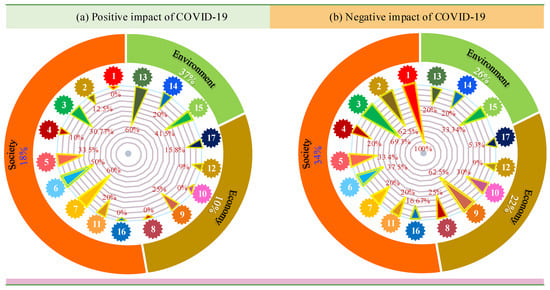 Assessment outline of the negative and positive impact of the COVID-19 pandemic on each SDG. Collected evidence on the impact of the pandemic on the 17 SDGs as (a) positive impact and (b) negative impact.