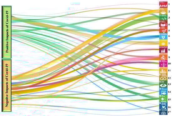 Impacts of the COVID-19 pandemic on each SDG towards achieving the 17 SDGs using Sankey diagram. Thicker line linkage indicates higher impact, with thinner line linkage indicates lower impacts towards respective SDG.