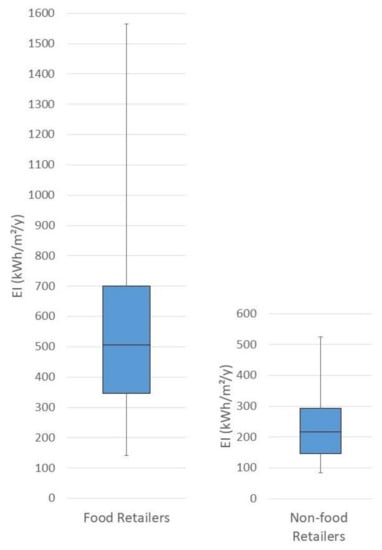 Boxplot of Energy Intensity (EI) benchmark for food and non-food retailers [73].