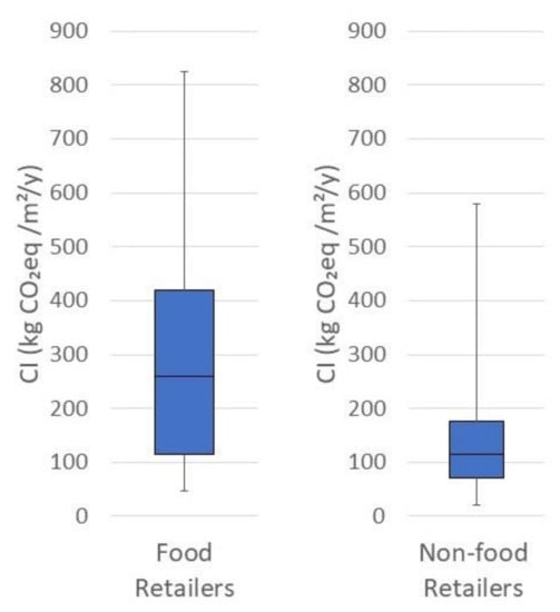 Boxplot of Carbon Intensity (CI) benchmark for food and non-food retailers [73].