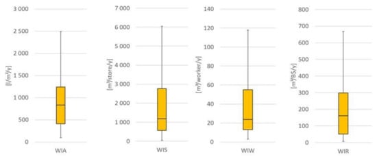 Boxplot of Water Intensity per store Area (WIA), Water Intensity per Store (WIS), Water Intensity per Worker (WIW), and Water Intensity per Revenue (WIR) [76].