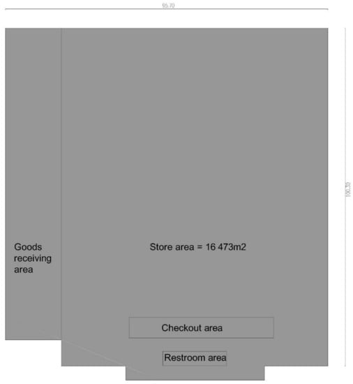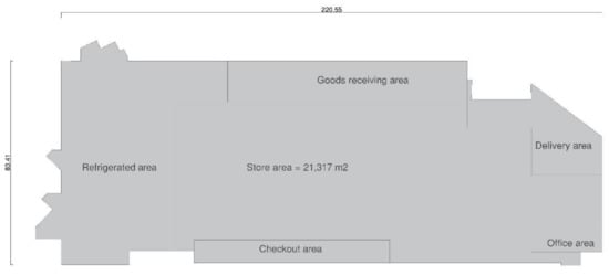 Case study 1 is a food store, a 21,317 m2 store in Lisbon, Portugal, part of the top global Cash & Carry Metro Group (Figure 4). The store has two main entrances, one in the food department and another in the non-food department. In the latter are located the reception, information desk, and restrooms. The mezzanine on the first floor is currently used as an independent gym.