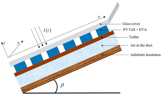 The solar cells are made up of monocrystalline technology and connected in series, making the installed capacity of the PV array 5 kWp. Toughened glass with a thickness of 0.0032 m, absorptivity of 0.1, and transmissivity of 0.85 is used at the top of the PV whereas Tedlar with a conductivity of 0.38 W/mK is used at the back of the PV, making an opaque type PVT system. A duct of depth 4 m is made below the Tedlar of the PV array. A 5V DC fan is used to flow the air through the duct at the rate of 1 kg/s. Figure 2b shows the cross-sectional view of the PVT system arrangement and Table 1 shows the detailed design parameters. The probability of adoption of such a PVT system by the household shall be higher because it replaces the construction of the traditional roof and thereby reduces the payback period, around 5 years when no incentives are provided by the government. The electrical output is higher than the traditional because of the lower temperature of the PV solar cells []. They have better resistance under tropical cyclones and do not easily topple or damage. The probability of theft is also reduced to a great extent. Neither the roof nor the PVT system has any tracking system. For ease of cleaning and higher exergy output through the PVT, an analysis is performed using the mathematical model when the PVT faces either north or south and its surface is inclined at an angle ranging from 0° to 60° from the horizontal.