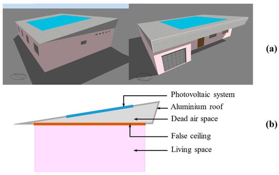 Pictorial view of a residential building with PVT system: (a) pictorial view, (b) cross-sectional view of nomenclature.
