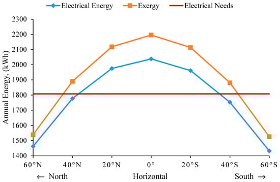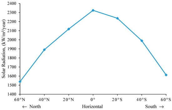The amount of total solar radiation received by photovoltaic panels over the year for different tilt inclinations of the PV panel, between 60° from the horizontal toward the north orientation and 60° from the horizontal toward the south orientation is shown in Figure 3.