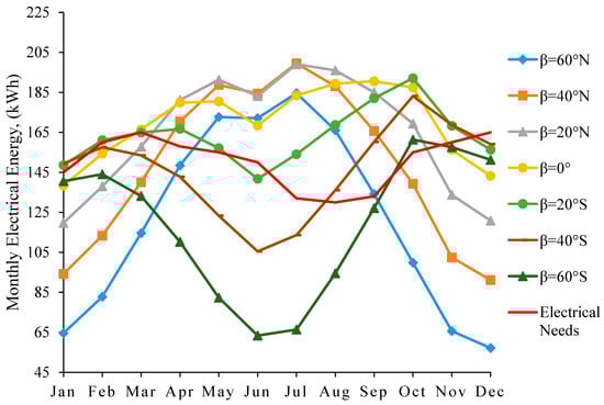 Figure 4 shows the variation of electrical energy output from the PVT system during a year for different inclinations and orientations (β) of the PVT surface. It is observed from this figure that the variation of electrical energy output with north orientation differs from south orientation at the same tilt inclination angle of the PV panel. Electrical energy increases for the north orientation and decreases for the south orientation and vice versa. This variation is more in the months of March to October. The maximum amount of monthly electrical energy is produced at the different tilt inclination angles for each month. The maximum monthly electrical energy of the PVT system is 199 kWh obtained at the tilt surface inclination angle of 20° in the month of July with north orientation. Over the year, the optimum monthly electrical output is required to cover the electrical needs of the house. Taking into account this parameter, the tilt inclination angle of the photovoltaic panel should be at 20° close to south for the month of January to February, 0° toward south for the month of March to April, 20° with north orientation for the month of May to August, 0° south oriented for the month of September, and 20° closed to south orientation for the month of October to December. The electrical consumption of the residential house is high in the summer season with a peak value of 165 kWh in the month of March. In tropical regions, the ambient temperature is high at this during this season and electrical energy is more required for cooling purposes. The PV panel tilt inclination angle between 0° and 20° south oriented is suitable for the optimisation of electrical output to cover the electrical needs over the year.