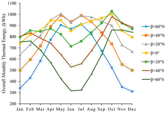 Figure 5 shows the variation of thermal energy output from the PVT system during a year for different inclinations and orientations of the PVT surface. It is observed that the variation of the overall thermal energy produced by the PVT system is the variation of electrical energy. This energy can be used in the months of November to December which is the cold season (winter) of the country. The overall thermal energy output of this period is 921.25 kWh and 871 kWh, respectively, and can raise the indoor air temperature of the residential home from 1.5 °C to 2 °C.