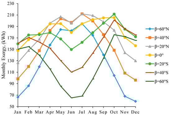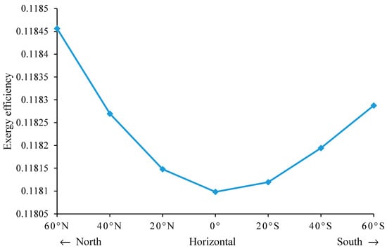 The variation of exergy output from the PVT system during a year for different inclinations and orientations of the PVT surface is shown in Figure 6. It is observed from this figure that the amount of net exergy produced by the PVT is largely a function of the angle at which the sun’s rays strike this surface at a constant mass flow rate of air flowing at the back sheet of the PV panel with a constant velocity. The optimum tilt inclination angle is different for each month. For the north and south orientations, the exergy production presents two maximums between January to June and June to December for each tilt inclination. The exergy efficiency of the PVT system over the year is presented in Figure 7. It is observed that the net exergy gain is produced with a marginal efficiency variation, from 11.81% to 11.84% over the year when the tilt inclination angle is increased which is south/north orientation.