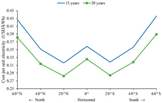 Figure 9 shows the cost per unit of electricity with tilt inclination angle. It is observed that the cost per unit of electricity between the tilt inclination angles from 0° to 20° with south/north orientation is USD 0.04 per kWh. The cost of electricity loss due to 20° tilt inclination angle can be compensated with the labour cost and work required for cleaning the PVT system of the horizontal roof.