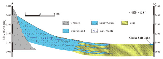 The Chaka basin is a closed fault basin that was fundamentally formed during the Cenozoic era. It is bounded by the Nanshan mountains in the north and the Ela mountains in the south and presents in the shape of a long strip in the NW direction. The lithology of the basin ranges from Paleozoic bedrocks to Quaternary deposits. The Mo river watershed is a typical part of the Chaka basin. The pre-Quaternary strata are mainly distributed in the upper reaches of the mountainous area and dominated by the Paleozoic and Triassic metamorphic rocks. The strata in the basin are predominantly Quaternary deposits with various lithologies. The lithologies of the Quaternary deposits in the basin vary from gravel in the piedmont to fine sand and clay in the lower reaches (Figure 2). Groundwater in the basin mainly occurs in the Quaternary aquifers. Due to the spatial variation of Quaternary deposits lithology, the Quaternary aquifers in the basin vary from a single thick phreatic aquifer in the piedmont to a semi-confined aquifer in the middle reaches, and finally, the multiple layers of phreatic-confined aquifers in the basin center. The groundwater of the basin predominantly originated from the leakage of river water at the piedmont. The lateral flow from the bedrock at the mountain pass also contributes some groundwater to the Quaternary aquifers. The contribution of local precipitation to the Quaternary aquifers in the basin is limited. Groundwater naturally discharges through springs and flows laterally into the Chaka salt lake. With the rapid development of the watershed, human pumping has become one of the dominant ways groundwater discharges into the watershed. Groundwater exploration is mainly concentrated in the Mo river and Chaka farms, and Chaka town (Figure 1c).