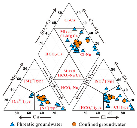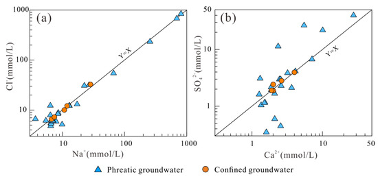 As presented in Figure 3, all collected groundwater samples except two phreatic groundwater samples are observed plotting in the [Na+] type dominance in the lower left of the Piper trilinear diagram, suggesting that Na+ is the predominant cation of groundwater in most sites of the watershed regardless of the sampling depth. The other two phreatic groundwater samples are situated in the [Na+] type dominance of the lower left trilinear, indicating Ca2+ is the dominant cation in these two groundwater samples. For the anions, all confined groundwater samples and almost all phreatic groundwater samples are situated in the [Cl−] type dominance in the lower right of the Piper trilinear diagram, indicating Cl− is the dominant anion for both phreatic groundwater and confined groundwater. Only one phreatic groundwater is observed plotting in the [SO42−] type dominance, and SO42− is the predominant anion. The diamond of the Piper trilinear diagram shows that all groundwater in the watershed plot from the mixed Cl-Mg·Ca type dominance to the Cl-Na type dominance. It can be seen that most of the collected groundwater samples, regardless of the depth, belonged to the Cl-Na type, and only a small part of phreatic (26.09%) and confined (20%) groundwater samples were mixed Cl-Mg·Ca type water. Overall, groundwater in phreatic aquifers is salty to some degree in terms of the hydrogeochemical facies, and confined groundwater is presented as fresher in nature compared to phreatic groundwater.