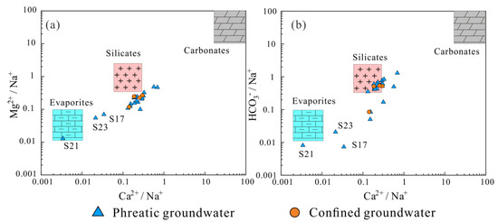As mentioned above, water–rock interactions are the predominant processes regulating the hydrogeochemical composition of both phreatic and confined groundwater samples in the watershed. There are various rocks and minerals existing in nature that are potentially involved in the water–rock interaction processes. In fact, not all of the rocks and minerals in nature would be involved in the interactions. The involved rocks/minerals in a specific aquifer are determined by the existing rocks/minerals and the hydrogeochemical conditions of aquifers along the groundwater flow path. To further illustrate the rocks and minerals involved in the water–rock interactions, the end-member diagrams that are constructed by the Ca2+/Na+ versus Mg2+/Na+ and HCO3−/Na+ [59] were introduced in the present research. These end-member diagrams separate into three dominances, i.e., the evaporite, silicate and carbonate dominances, and can be used to virtually identify the main rock types (Figure 5) involved in the water–rock interactions. As shown in Figure 5, all confined groundwater samples and most of the phreatic groundwater samples are located in and around the silicate dominance, indicating that silicate weathering (Equation (1)) is the predominant source of solutes for groundwater regardless of the depth in the Mo river watershed. A small portion of the phreatic groundwater samples was observably situated in and around the evaporite dominance, suggesting that evaporite dissolution is the dominant source for the major ions of phreatic groundwater at some locations. No phreatic or confined groundwater was situated in or around the carbonate dominance, implying carbonate dissolution is not the main process contributing to groundwater chemistry in the watershed.