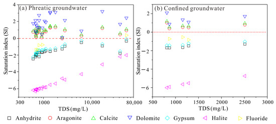 Plots of TDS versus minerals’ saturation index for (a) phreatic groundwater and (b) confined groundwater.