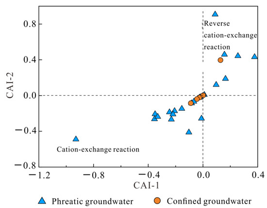 Aside from the silicate weathering and evaporite dissolution, the ion exchanges are usually important processes contributing to groundwater solutes, especially in sedimentary aquifers. The ion processes can be revealed by the chloro-alkaline indices. The chloro-alkaline indices of CAI-1 and CAI-2 can be obtained by Equations (2) and (3). The combination of these two chloro-alkaline indices can be used to reveal the ion exchange processes occurring in aquifers. If these two indices are below zero, then the cation-exchange reaction (Equation (4)) is the dominant reaction occurring in the aquifer. However, if both CAI-1 and CAI-2 are positive, a reverse cation-exchange reaction (Equation (5)) is implied. As shown in Figure 8, most of the phreatic groundwater samples and confined groundwater samples are situated in the left lower dominance of the diagram and with both CAI-1 and CAI-2 below zero, implying that the cation-exchange reaction (Equation (4)) is one of the dominant processes regulating the hydrogeochemical composition of groundwater in phreatic and confined aquifers at most of the sites in the Mo river watershed. In addition, several collected phreatic groundwater samples and one confined groundwater sample had positive CAI-1 and CAI-2 values, suggesting the occurrence of reverse cation-exchange reactions at these sites.