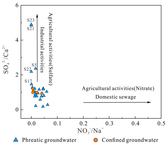 To further illustrate the specific anthropogenic factors influencing groundwater chemistry, the relationship between the molar ratios of NO3−/Na+ and SO42−/Ca2+ was determined. As shown in Figure 9, no phreatic and confined groundwater is plotted in the lower right dominance region of the diagram, indicating that the groundwater in the watershed is out of the significant influence of domestic sewage and agricultural nitrogen fertilizers. Some phreatic groundwater samples are situated in the upper left dominance of the diagram, implying the potential influence of industrial wastes or agricultural sulfate fertilizers. The land use and cover showed there are no industrial areas but agricultural lands and human settlements in the watershed. Thus, the agricultural application of sulfate fertilizers rather than nitrite fertilizers in the middle reaches of the watershed is an important source of chemicals in groundwater. This was evidenced by the correlation matrix, in which TDS showed no significant relation with NO3− but SO42− (Table 2).