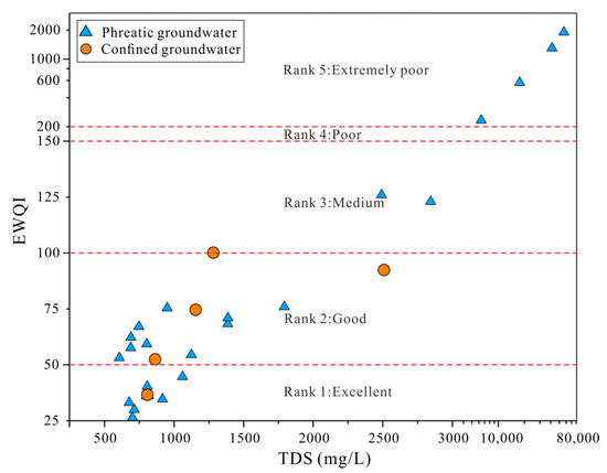 Plots of TDS versus EWQI values of phreatic and confined groundwater.