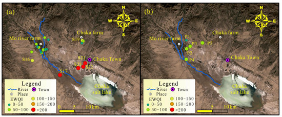 The distributions of groundwater quality in various aquifers are presented in Figure 11. As shown in Figure 11a, most of the collected phreatic groundwater samples in the watershed are of excellent or good quality. It can be seen that the phreatic groundwater of relatively good quality is dominantly distributed in the middle-upper reaches of the watershed. The two medium-quality groundwater samples are located on the southwestern margin of the basin and the Chaka farm. All of the extremely poor-quality phreatic groundwater samples are situated in the lower parts of the watershed and adjacent to the Chaka salt lake. The phreatic groundwater samples that presented a worse quality trend are in the upper to lower reaches of the watershed. All of the medium and extremely poor -quality phreatic groundwater samples are featured with high salinity. The relatively poor quality of phreatic groundwater in the watershed is ascribed to the high salinity rather than the high concentration of potentially toxic elements. Although the middle-lower reaches have worse groundwater quality than the upper reach, all collected confined groundwater samples are of excellent or good quality based on the EWQI values (all less than 100) (Figure 11b). Overall, the confined groundwater at all sampling sites and the phreatic groundwater in the middle-upper reaches of the watershed are of relatively good water quality and are suitable for various domestic usages. Contrastingly, phreatic groundwater in the lower reaches adjacent to the salt lake is not suitable for domestic purposes due to the high salinity.